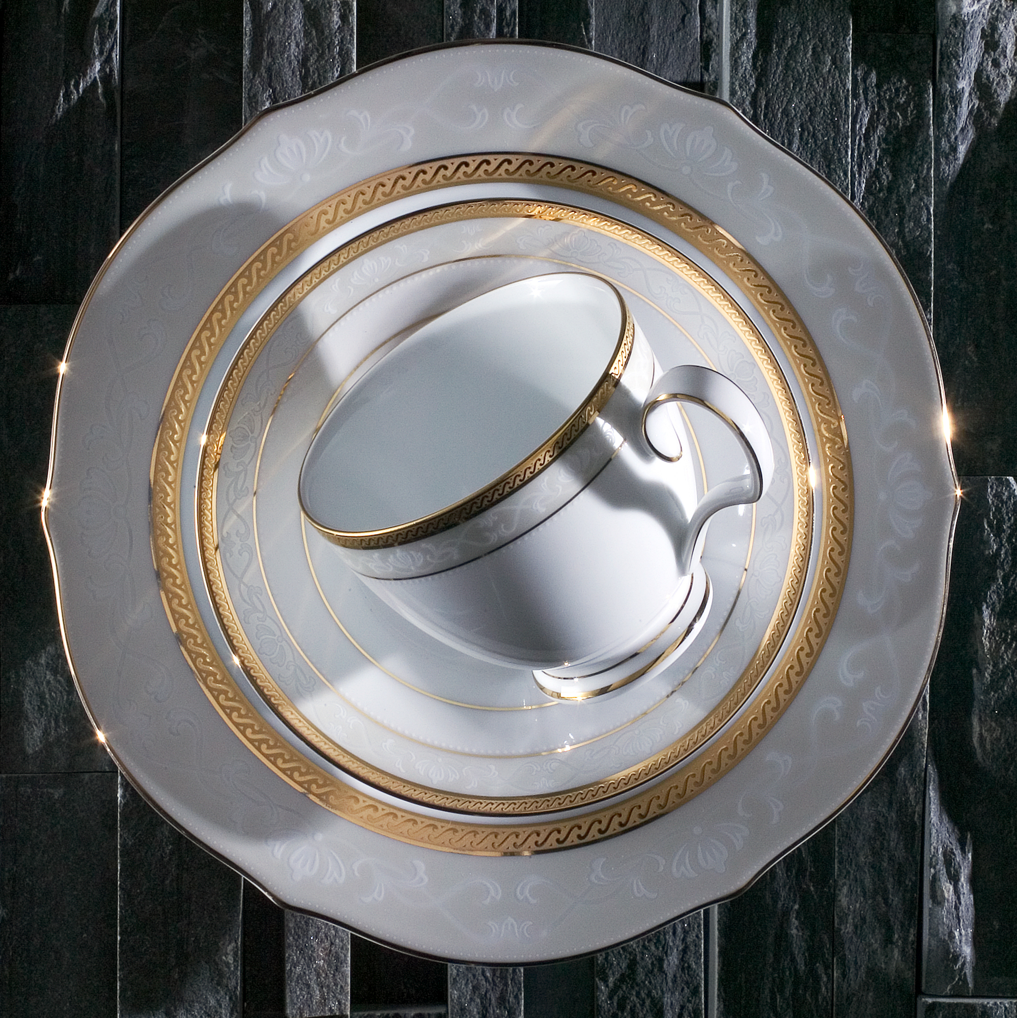 Hampshire Gold is a superb classical styled design packed full of features. A delicate lace patterns adorns a sleek satin band in sandy cream, contrasted by a richly embossed 22K gold trim – all on a body of the finest white porcelain. Although formal in style it is also well suited for everyday use. Chip Resistant and Dishwasher Safe.