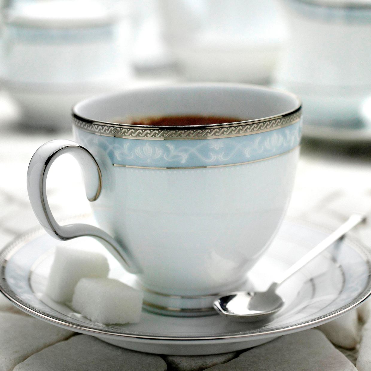 Hampshire Platinum is a superb formal design packed full of features. A delicate lace patterns adorns a sleek ice blue satin band, contrasted by a richly embossed platinum trim – all on a body of the finest white porcelain. Although formal in style it is also well suited for everyday use. Chip Resistant and Dishwasher Safe.