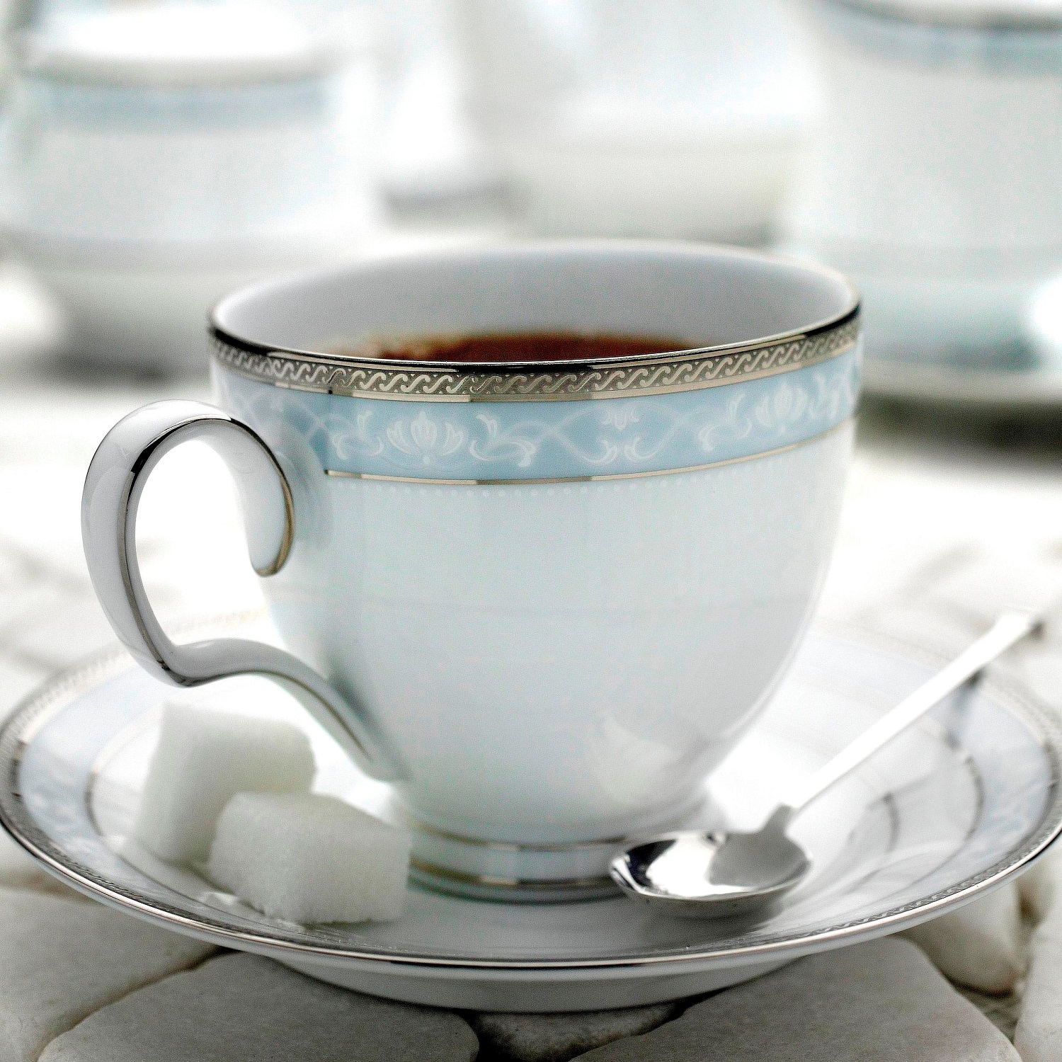 Hampshire Platinum is a superb formal design packed full of features. A delicate lace patterns adorns a sleek ice blue satin band, contrasted by a richly embossed platinum trim – all on a body of the finest white porcelain. Although formal in style it is also well suited for everyday use. Chip Resistant and Dishwasher Safe.