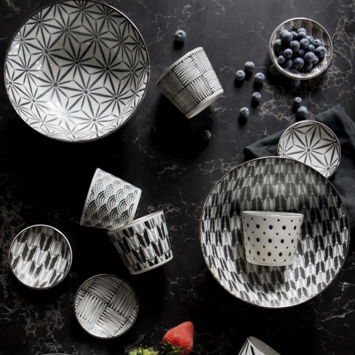 Komon fine porcelain giftware is designed and manufactured in Japan. It features a modern form of Japanism steeped in tradition, with intricate black and white patterning the perfect canvas for presentation of soups, salads, pasta and desserts.  Distributed by Noritake for an affiliated Japanese factory, the Komon collection is truly authentic tableware for lovers of all things Japanese. It is dishwasher and microwave safe