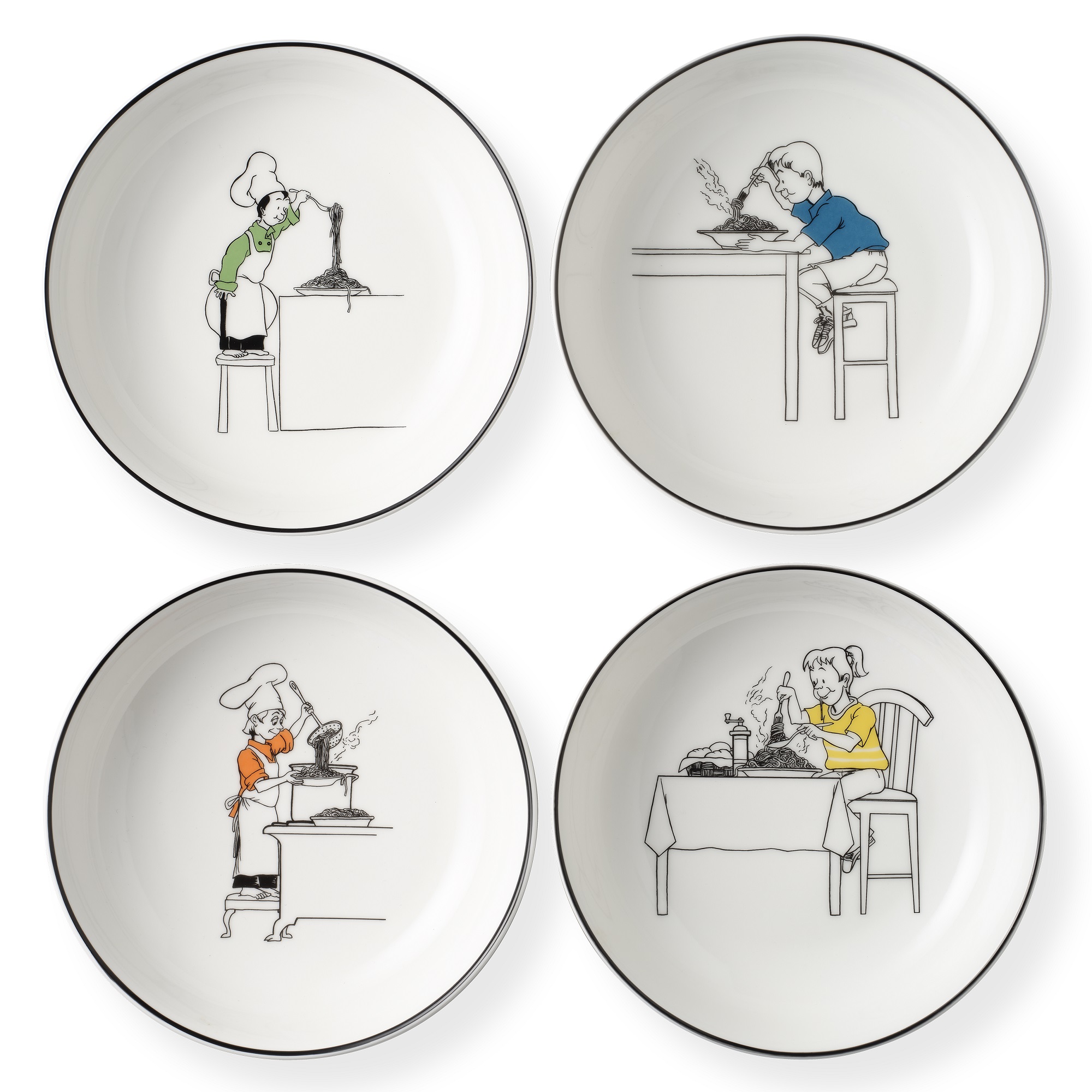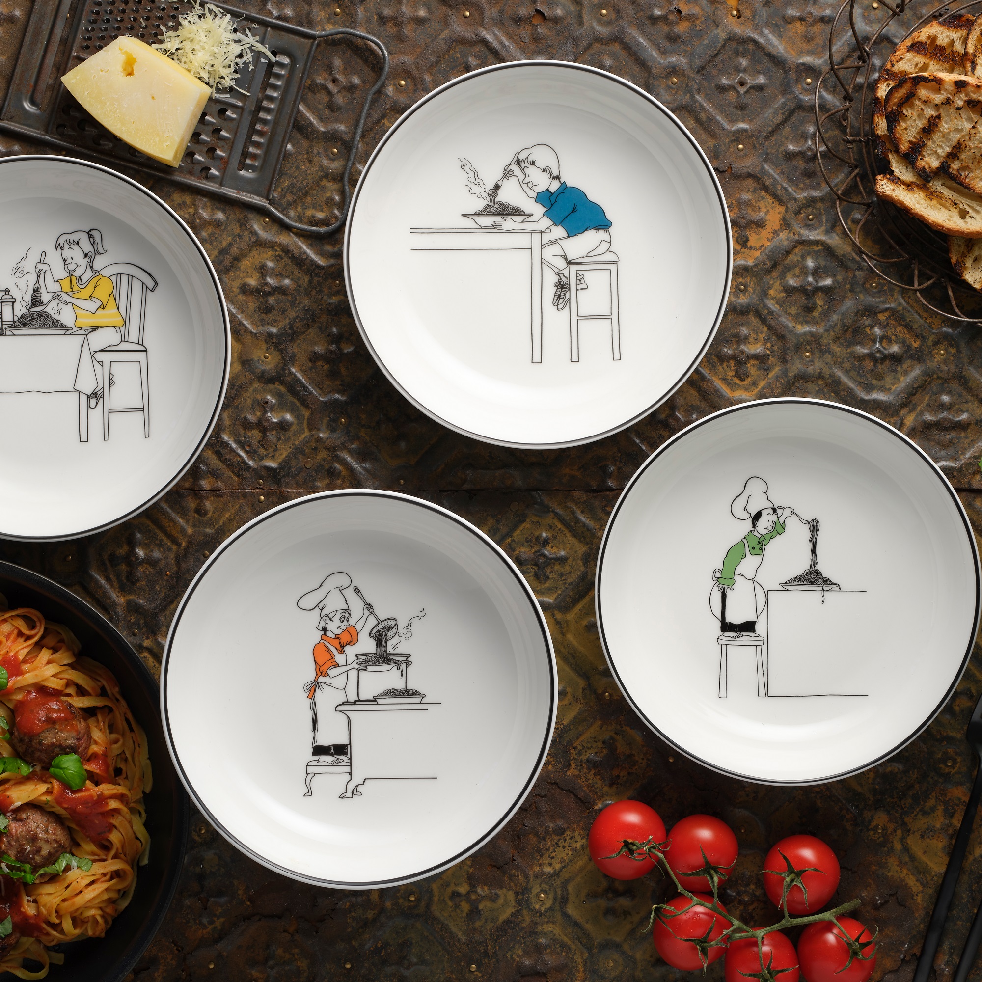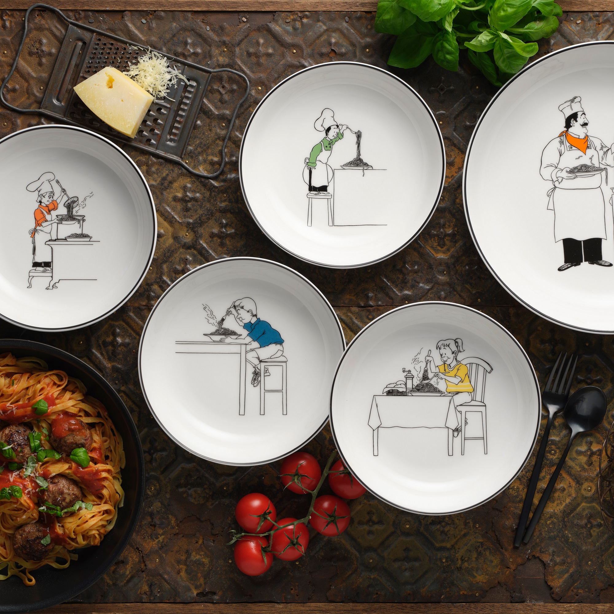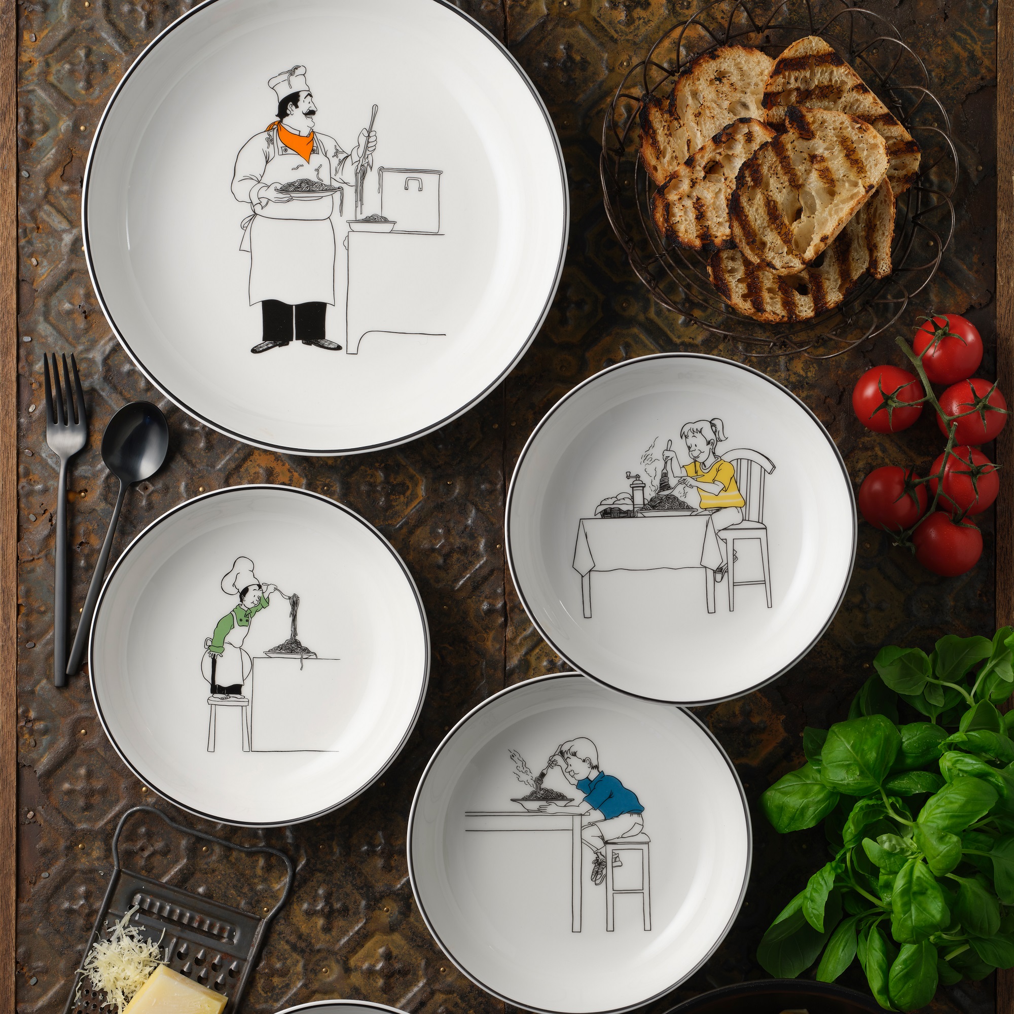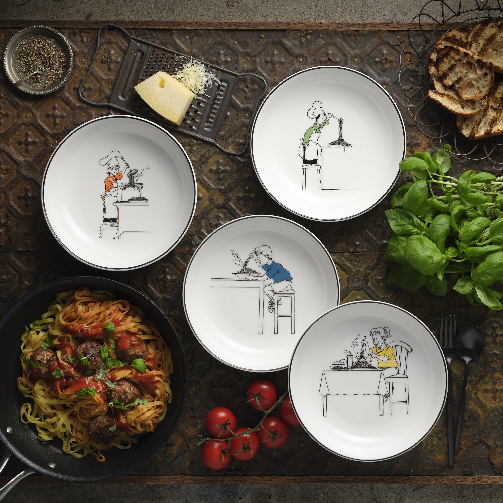 Le Restaurant is a quirky pattern that features a series of amusing black and white French bistro illustrations on a durable ivory porcelain body. This pattern is lots of fun, extremely functional and designed for everyday usage (it would make a great holiday home setting). Le Restaurant is chip resistant, dishwasher and microwave safe.