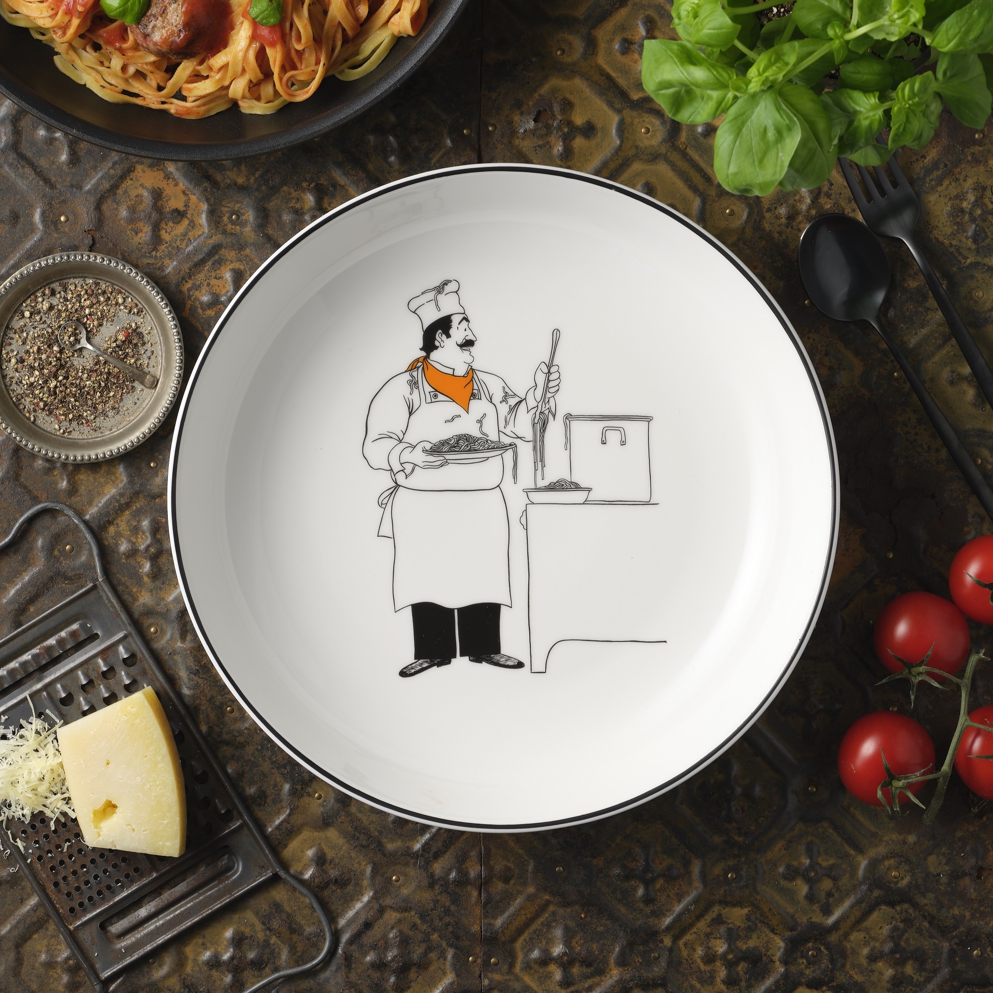 Le Restaurant is a quirky pattern that features a series of amusing black and white French bistro cartoons on a very durable ivory porcelain body. This pattern is lots of fun, extremely functional and designed for everyday usage (it would make a great holiday home setting). Le Restaurant is chip resistant, dishwasher, and microwave safe. Giftboxed
