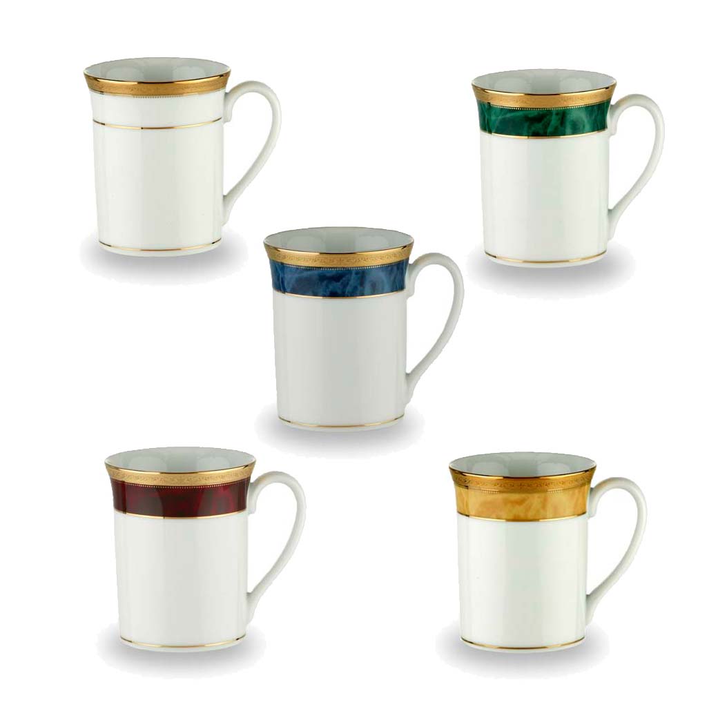 Majestic is a regal collection of fine white porcelain mugs in classical styling, with five different opulent faux marble finishes and a rich embossed 22K gold band. Mugs are a tall beaker style, very elegant and perfect for keeping your beverage warm. Majestic Mugs are chip-resistant and dishwasher safe