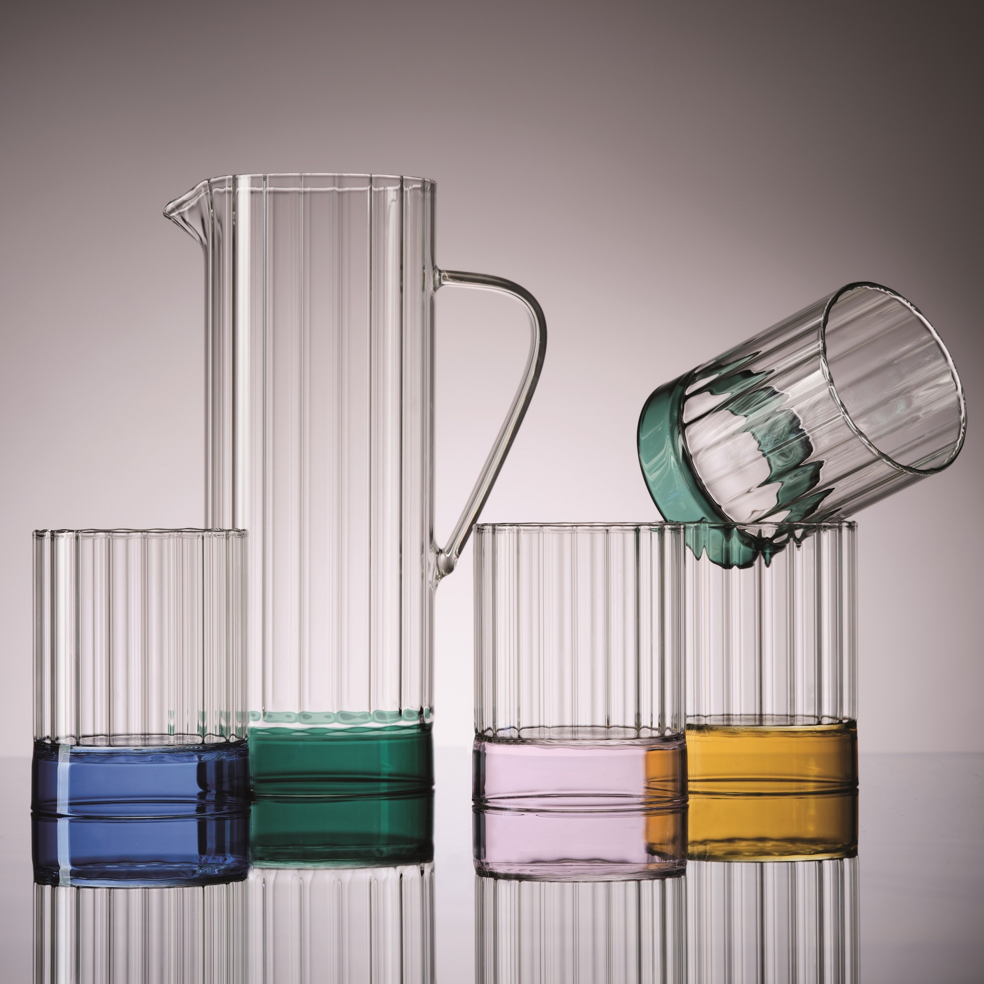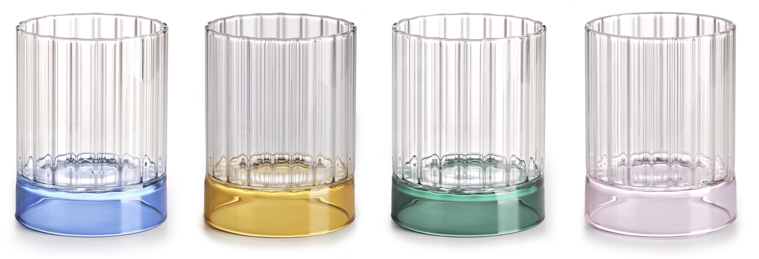 From Master Glassmakers IVV the Quattro designer Tumblers are crafted from premium borosilicate glass. The set contains four striated clear tumblers each of which feature a different coloured base. Light, yet quite robust, the Quattro Note Tumbler set’s unique styling will definitely turn heads when entertaining but can also be used every day with confidence. The glasses are heat/thermal shock resistant and dishwasher safe (colour is in the glass)